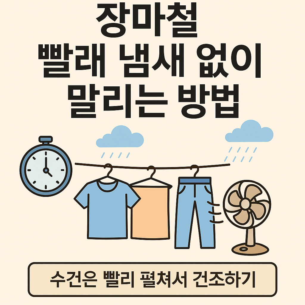 장마철만 되면 빨래에서눅눅하고 퀴퀴한 냄새가 나서고민되시죠?제대로 말리지 못하면 세균이번식해 냄새뿐 아니라건강에도 영향을 줄 수 있어요.오늘은 장마철에도 빨래 냄새 없이 보송하게 말리는 방법을소개 해 볼께요. 1. 빨래 후 바로 널기세탁이 끝나면 바로 널어야 해요.시간이 지나면 세균이 번식해냄새가심해질 수 있습니다.특히 수건은 겹치지 않게 펴서말려주세요.2. 공기 순환이 잘되는 공간 선택빨래는 통풍이 잘 되는 공간에널어야 빨리 마릅니다.창문 근처, 환풍기 주변, 선풍기 앞이효과적이에요.바람이 잘 통하면 건조 속도가확실히 빨라져요.3. 선풍기 또는 제습기 활용햇빛이 없어도 걱정 마세요!선풍기나 제습기를활용하면습기를 빨리 없앨 수 있어요.빨래에 직접바람을 쐬어주면 냄새 걱정도줄어듭니다.4. 옷 사이 간격 ..